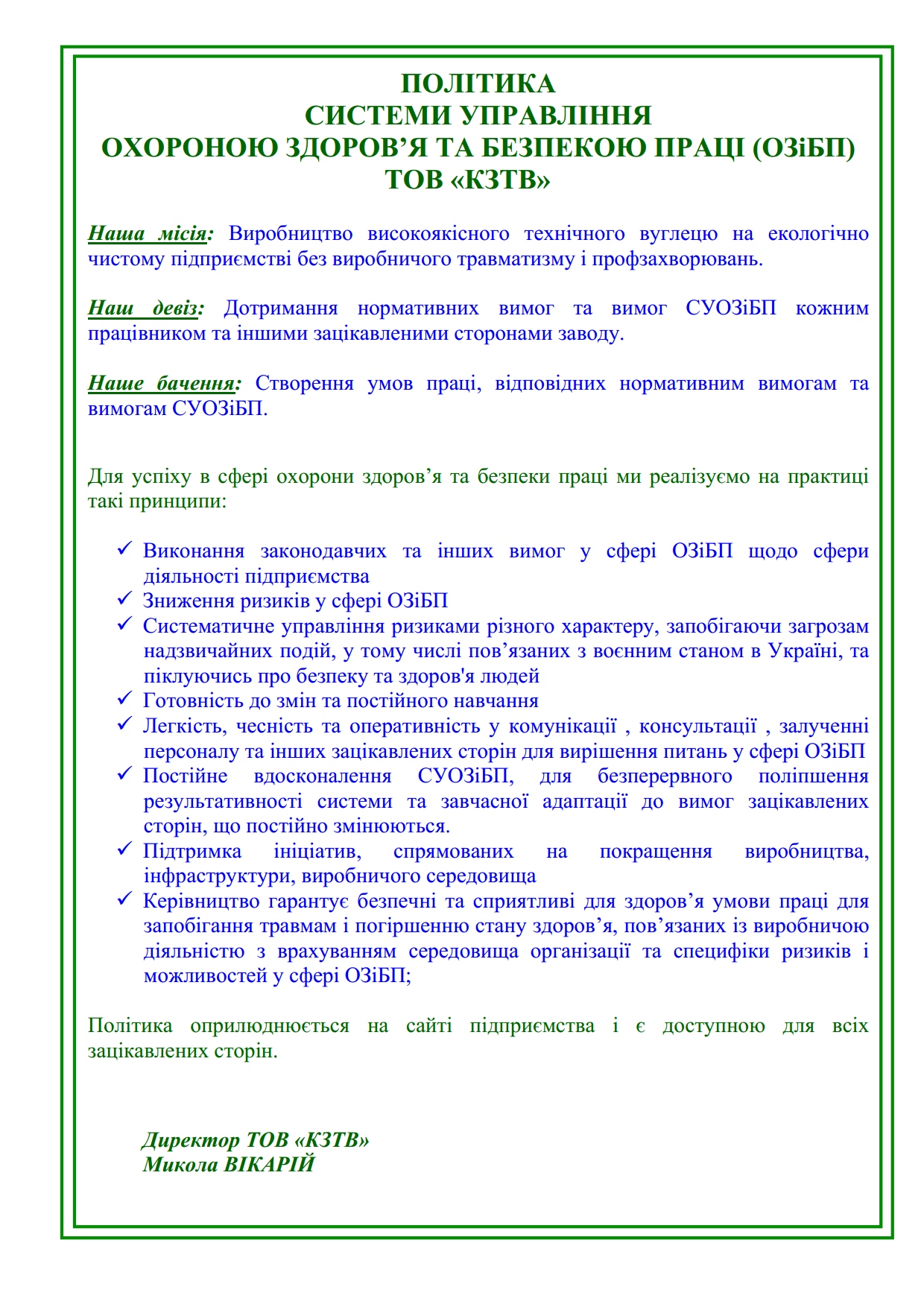 Політика системи управління охороною здоров’я та безпекою праці (ОЗіБП)